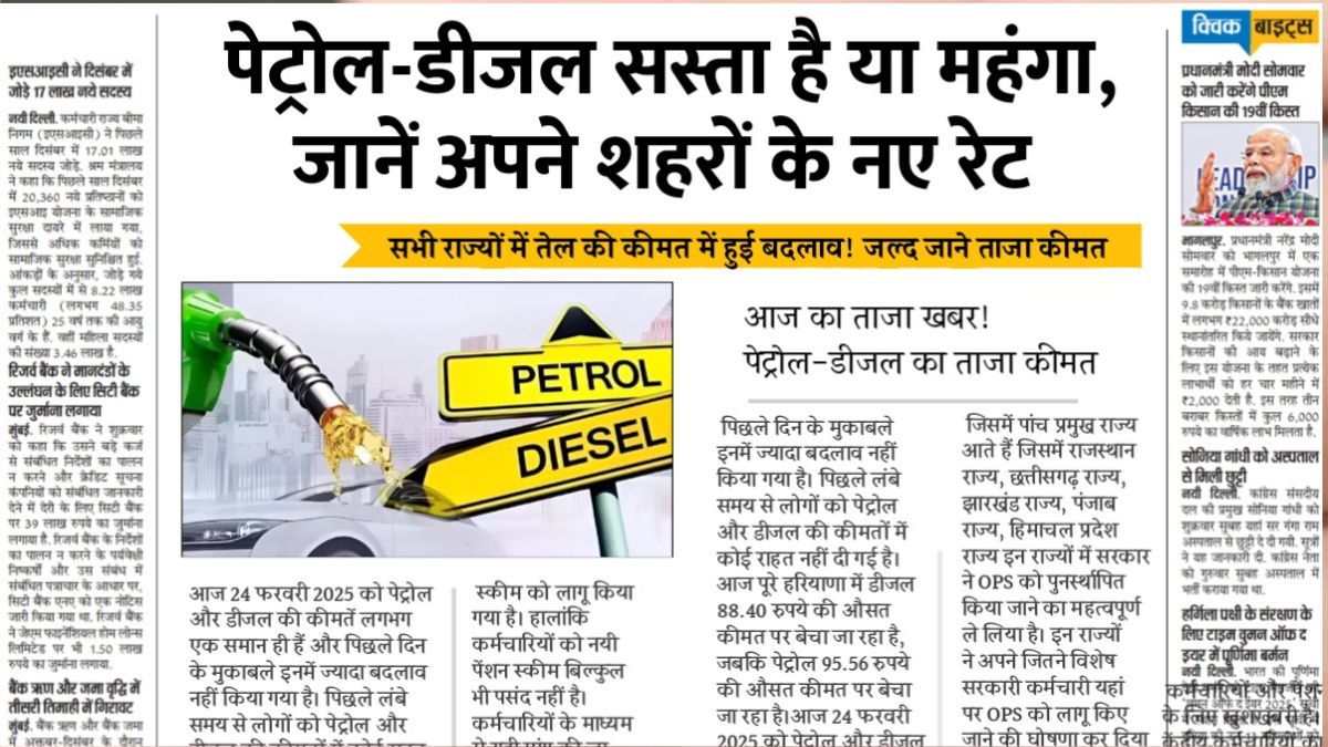 आज, 24 फरवरी 2025 को, पेट्रोल और डीजल की कीमतों में कोई बड़ा बदलाव नहीं किया गया है। लंबे समय से आम जनता को इन ईंधनों की कीमतों में कोई राहत नहीं मिली है। हरियाणा में आज डीजल की औसत कीमत ₹88.40 प्रति लीटर और पेट्रोल की औसत कीमत ₹95.56 प्रति लीटर है।
